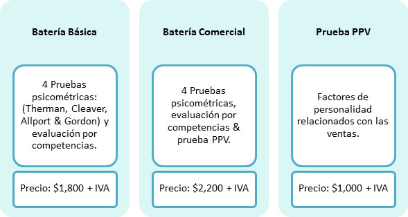 Contamos con tres tipos de baterías de pruebas de acuerdo al puesto a evaluar, los costos son los siguientes: